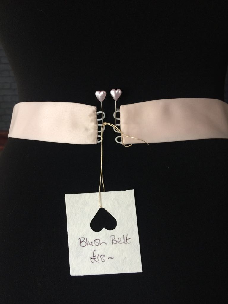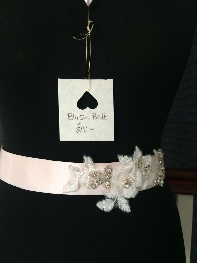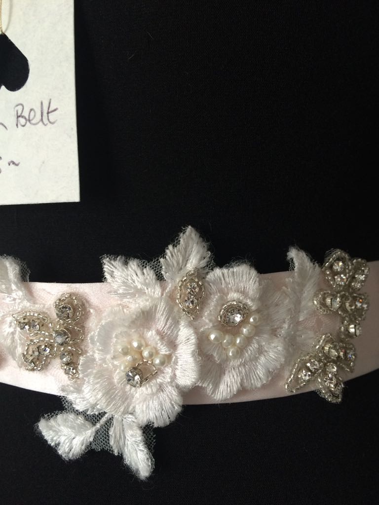 Ivory applique floral motif with pearls, beads and diamante on a blush pink soft satin belt. Designed to close on the buttons of the dress at the centre back which places the motif to the side front. Measurements are 82/83cms waist and the belt is 4cms.
